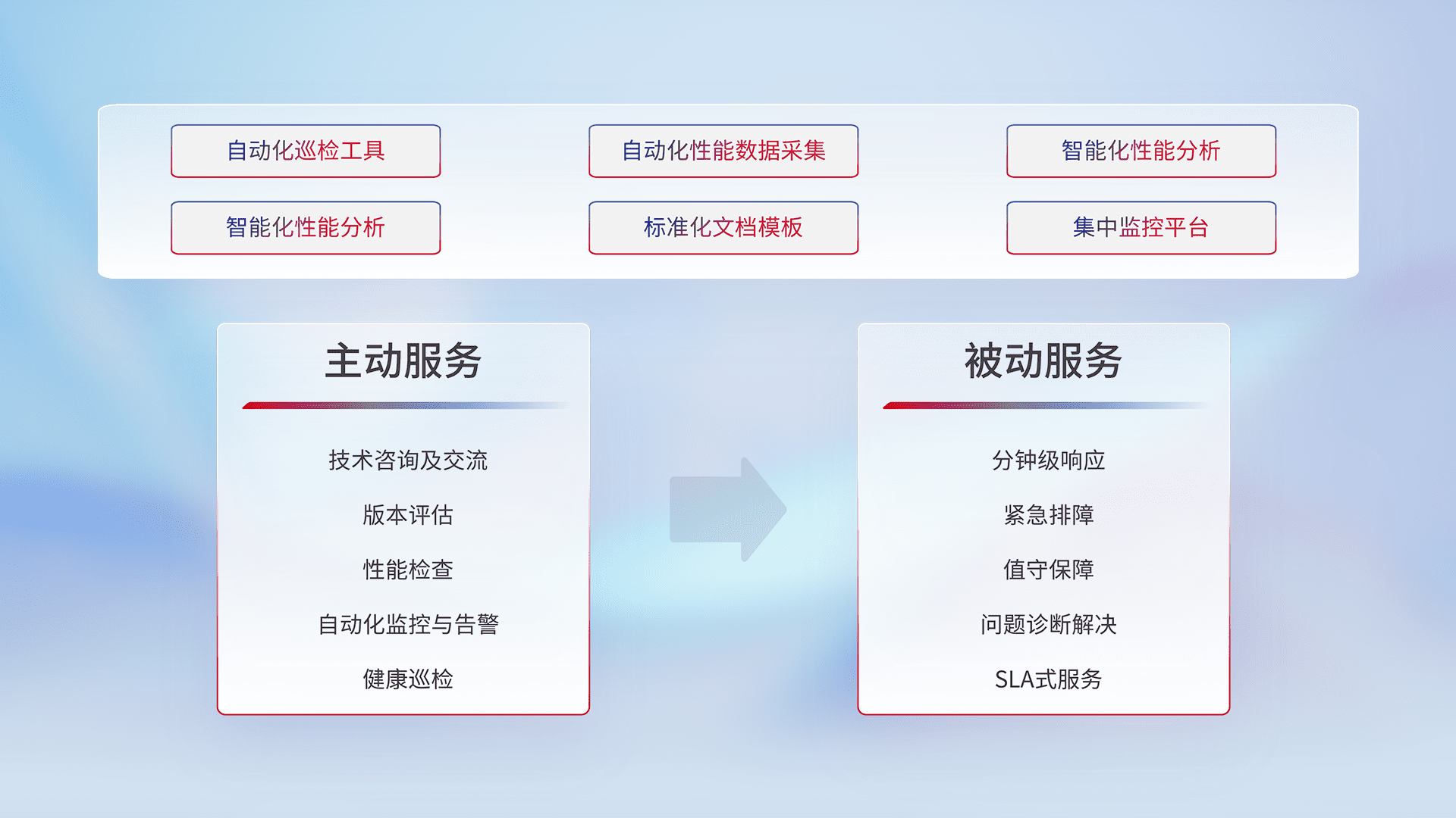 智能化工具和标准化文档,,,,保障服务质量,,,,提供主动服务(包含技术咨询、、、、版本评估、、、、性能检查、、、、自动化监控与告警、、、健康巡检)和被动服务包含(分钟级响应、、紧急排障、、、、值守保障、、问题诊断解决、、SLA服务)。。